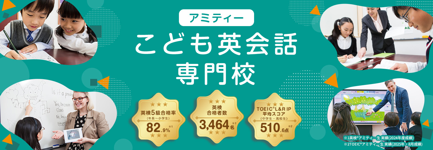 アミティー生徒の多くが、幼児〜小学生の段階で英検®5級・4級・3級、中学生〜高校生の段階で準2級以上を取得します。また、英検Jr.でもアミティー生徒の平均正答率は全国平均を上回り、TOEIC ®においても多くの生徒が高い成績をおさめています。