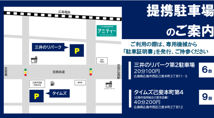 アミティー己斐校には、3台の専用駐車場のほか、以下の2か所に提携駐車場があります。