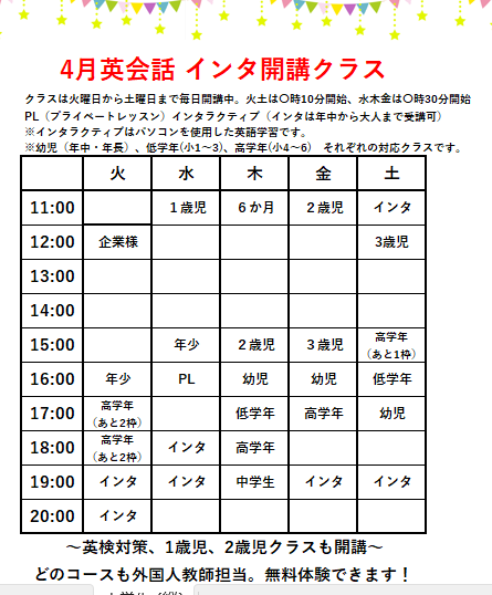 ベビークラスは大人気。土曜日も開講!赤ちゃんでしか聞き取れない音があります。小さい時から英語のシャワーを浴びて、苦労なく英語耳を鍛えましょう♪