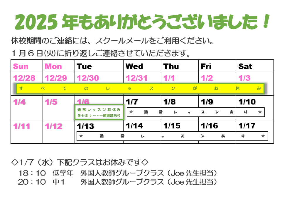 ※1/6(火)は通常レッスンはお休みで、冬セミナーのみの開講となります