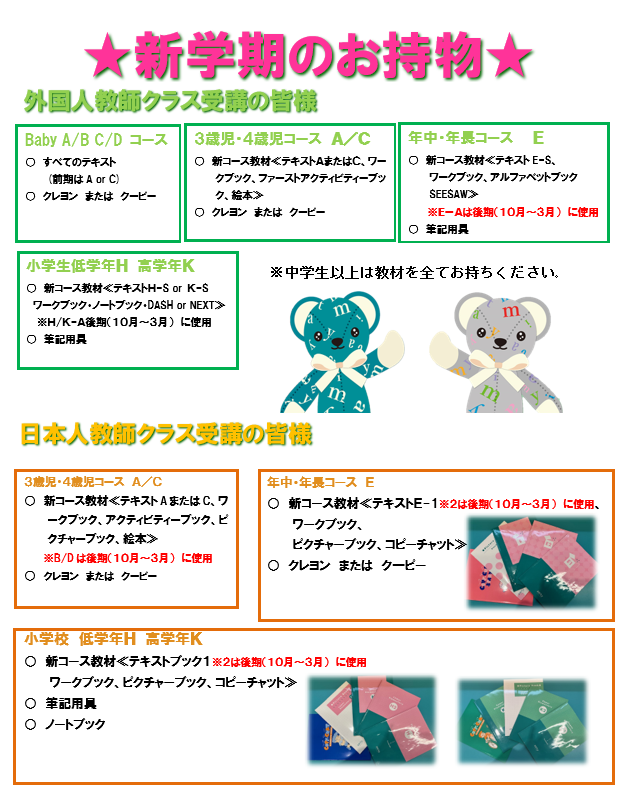 教材も新しくなりますので、必ず全ての持ち物にご記名をお願いいたします。