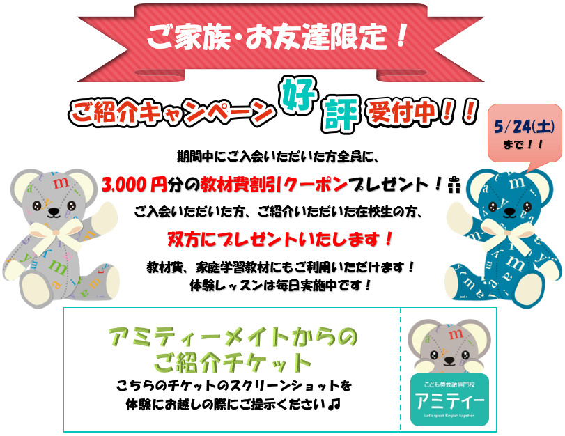 ご兄弟姉妹・保護者の皆様・お友達のご紹介で英語学習スタートや、