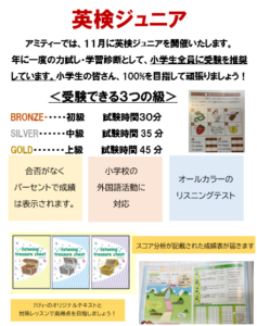 アミティーでは毎年秋に英検ジュニアを小1~小6のお子様を対象に受験頂いています。