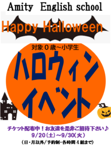 アミティーでは親子一緒に参加可能な【Halloween Event】を実施します!ゲームに工作まで♬一緒に異文化体験しましょう<ご予約期間>9/19~9/30 <イベント開催>9/20(土)~9/30(火)日・月以外でご案内します。