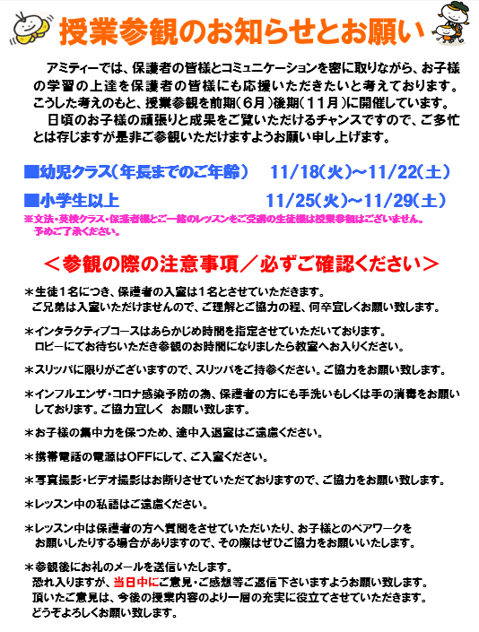 現在アミティーに通っている方、前に通っていた方、新規の方も大歓迎です!