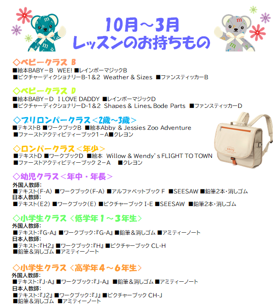 特にお子様のみのクラスからは、テキストの入れ違い紛失防止の為にもよろしくお願いいたします。