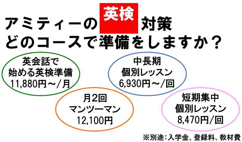 アミティーのレッスンでは、幼児・小学生で英検5級・4級~3級、中学生・高校生で英検準2級~準1級に合格可能なレベルの英語力・英会話力を身につけられます。英検®対策クラスでは、各級にポイントを絞った学習に取り組み、より確実に合格に近づけます。