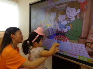 アミティーでは大きな画面(iLesson)を使ってレッスンをします。