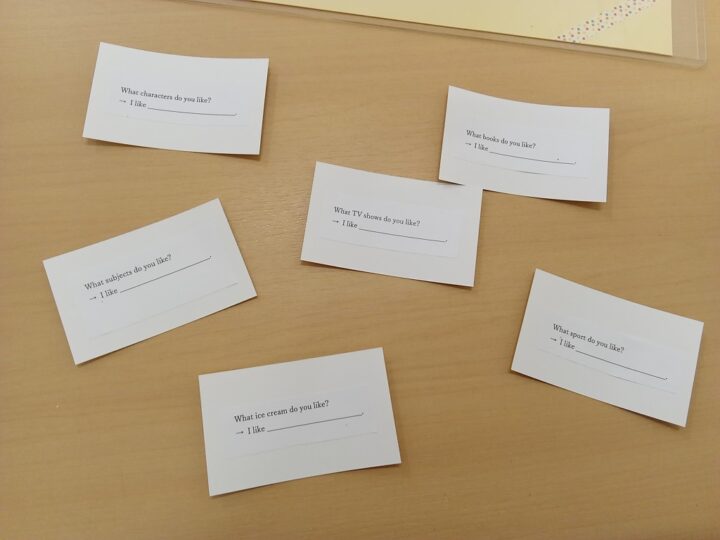 作ったすごろくで遊びながら、特定のマスに止まったらお友達に英語で質問してみましょう♪