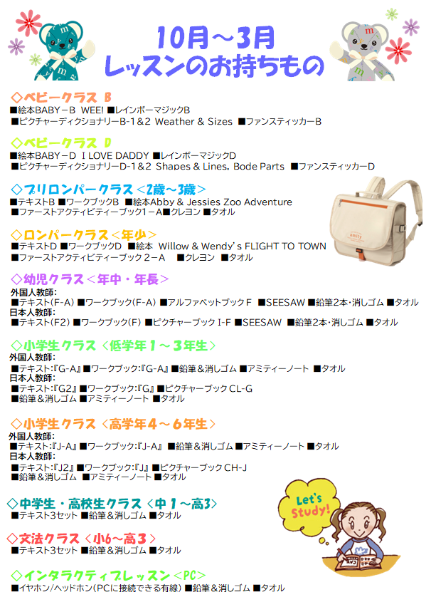 特にお子様のみのクラスからは、テキストの入れ違い紛失防止の為にもよろしくお願いいたします。
