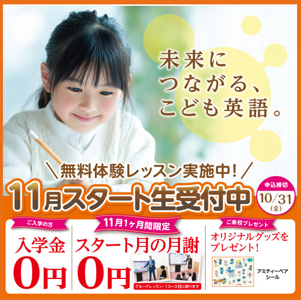 10月は無料で<2コース目>が受けられるキャンペーンで応援します!お問い合わせはお電話、または体験レッスン申込画面よりどうぞ。