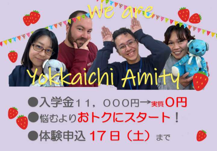 アミティー四日市校は、12/28(日)~1/5(月)までお休みです。すべてのレッスンがお休みですのでご注意ください。年明けは1/6(火)より一部レッスン実施、1/7(水)よりすべての月謝制レッスンがスタートします。皆さん、元気に通学してくださいね✨問合せや体験レッスン申込の方への対応は、1/6(火)より行いますので、しばらくお待ちくださいませ💛