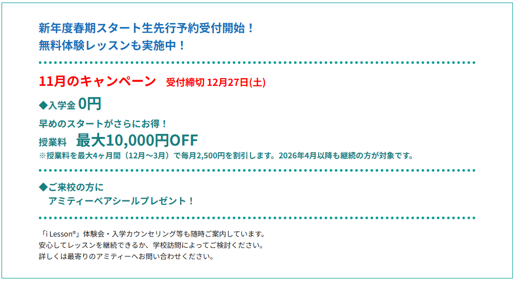 入学金0円+授業料最大10,000円OFFの11月キャンペーンを活かして、年内の成長につなげましょう。